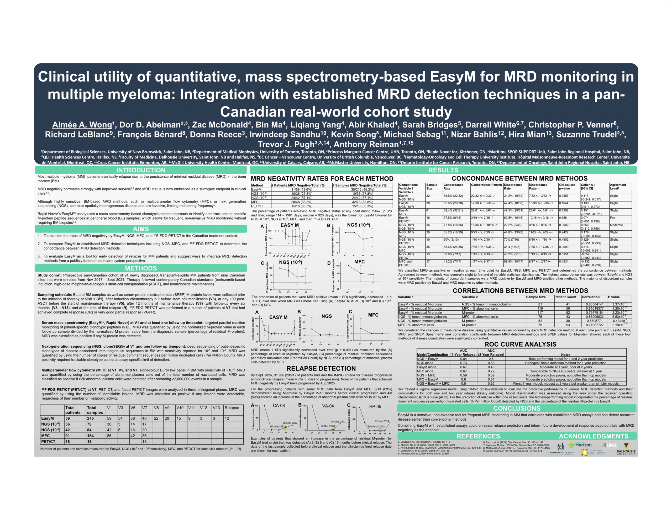 This study evaluated 91 newly diagnosed, transplant-eligible MM patients across Canada, monitored longitudinally from diagnosis through maintenance therapy. EasyM results from peripheral blood were compared with BM next-generation sequencing (NGS, 10⁻⁵ and 10⁻⁶ sensitivity), multiparameter flow cytometry (MFC), and 18F-FDG PET/CT imaging. Samples were collected at key treatment milestones: post-induction chemotherapy, 100 days post-transplant, after 12 months of maintenance therapy, and every six months thereafter, with a median follow-up of 920 days.